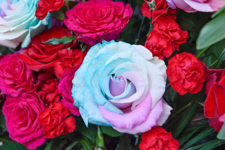 Unusual pink and white rose in gentle cold romantic tones on colorful background. Valentine's day, love, romance, wedding concept.