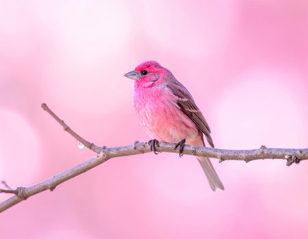 A bright pink male finch is perched on a bare branch with a soft pink bokeh background.