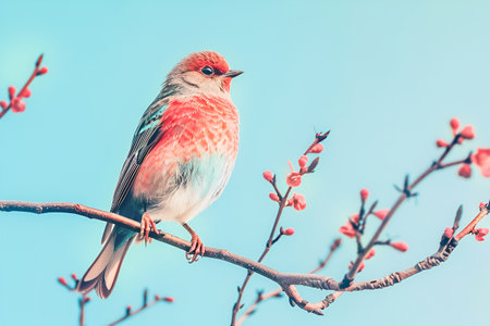 small bird perched on a branch surrounded by vibrant pink flowers. the photo captures a beautiful blend of light red and light brown tones, reminiscent of the artistic styles of flora borsi, mandy disher, and peter blume. the image showcases photo-realistic techniques, while also evoking a sense of confucian ideology. a perfect representation of the emerging caninecore aesthetic. ai generated