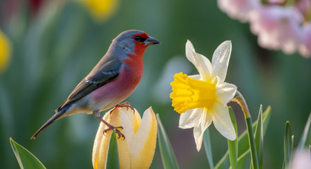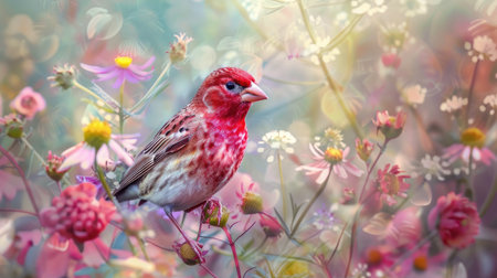 Colorful finch perched on a blooming wildflower, capturing the vibrant essence of springtime in nature