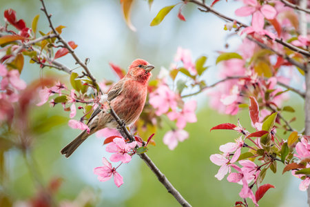 A male House Finch perched in the blooming Crabapple Tree surrounded by dreamy pink blossoms on a Spring day.