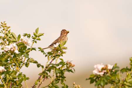Corn Bunting with food in beak on the branches of flowering grass. Miliaria calandra.