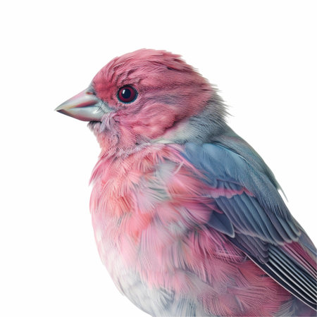 a small red bird, with intense coloration in light pink and dark crimson, stands against a white background. the photo captures accurate bird specimens in a multilayered style reminiscent of troubadour art. the image is taken with provia film, showcasing vibrant colors and intricate details, reminiscent of the works of michelangelo. ai generated