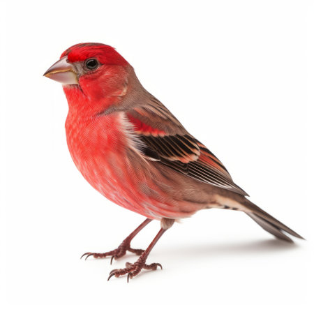 A vibrant male house finch with striking red plumage is showcased against a clean white background, highlighting its detailed feathers and form.