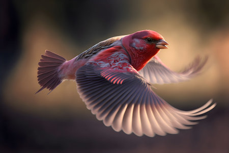 Illustrative drawing of a Common Rosefinch bird flying with open wings. Blurred background. Generative AI.
