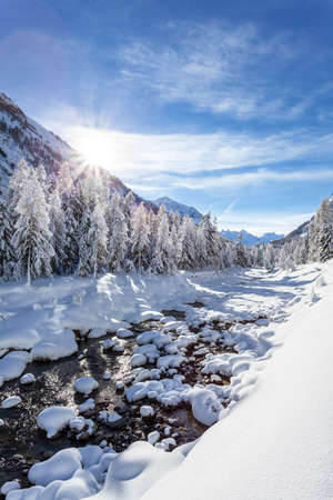 Frozen mountain river with snow covered pines. Winter in mountains