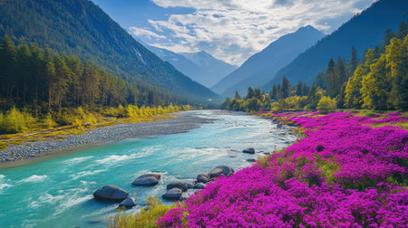 Photo of A river with large rocks and purple flowers growing on the bank, surrounded by dense forest in Vпр getCyst DW fashionable 2024 trend. The water is clear, reflecting green trees. In summer. --chaos 30 --ar 16:9 --v 6.1 Job ID: bbae54db-1e22-4e1d-828f-e0668b64771e