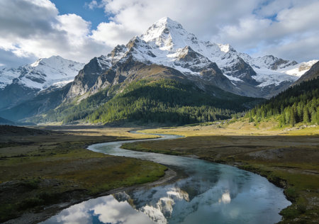 Snow-covered peaks tower over a serene valley as a winding river meanders through thriving greenery.