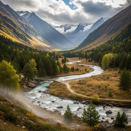 A majestic mountain valley bathed in autumn light, with a winding river flowing through vibrant trees and golden meadows.