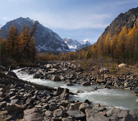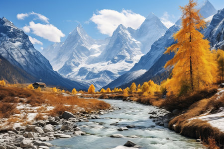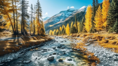 beautiful autumnal scenic landscape in alpine valley crossing by a river with golden larch trees in forest and snowy mountain range background in tarentaise, savoie france