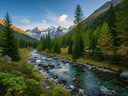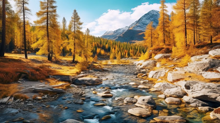 panoramic view of autumnal alpine landscape with mountain river