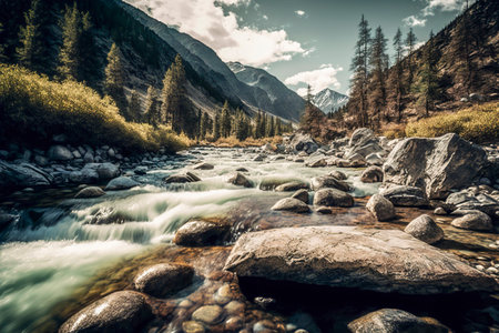 A river running through a valley with rocks and trees. Generative AI.