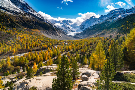 Autumn landscape in the Swiss Alps in Pontresina near Saint Moritz with beautiful yellow larches and a stream