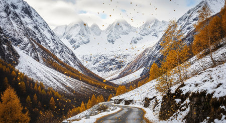 Shedding showing winding mountain road through a valley with snow-capped peaks and autumn trees shedding golden...