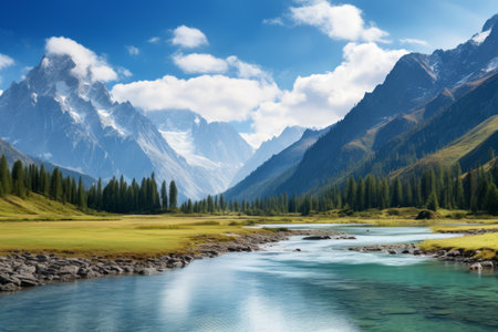 Beautiful mountain landscape with river, mountains, clouds and blue sky