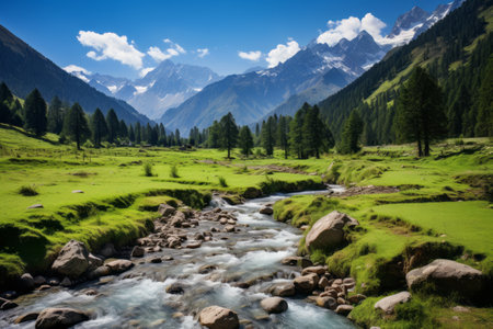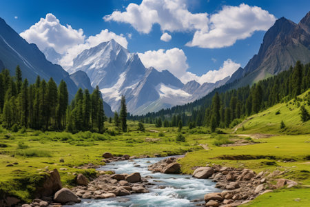 Beautiful mountain landscape with a river flowing through it in the mountains, Baishui River also known as Baishui Tai, AI Generated