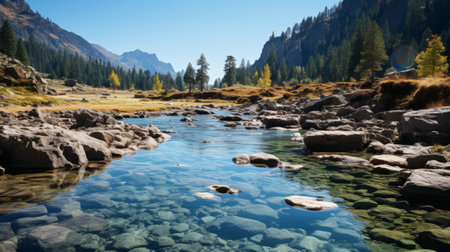This captivating image features a crystal-clear river flowing through a rocky landscape, framed by lush trees. The serene atmosphere and vibrant colors create a perfect outdoor escape.