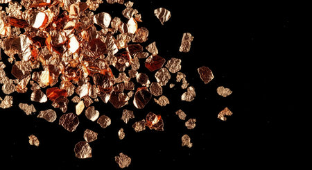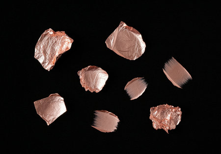 Rose gold foil fragments and shimmering metallic brushstrokes scattered randomly against a deep black background, perfect for luxury design or beauty concepts.