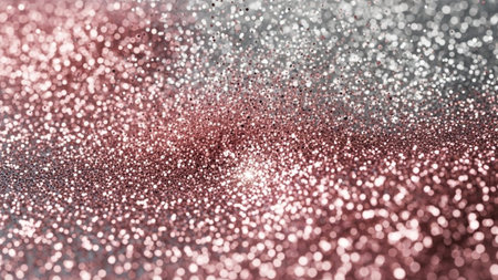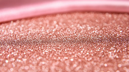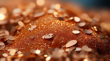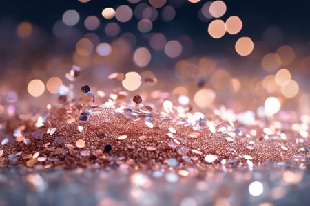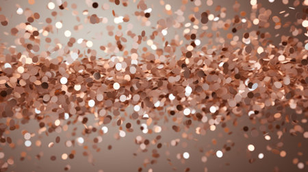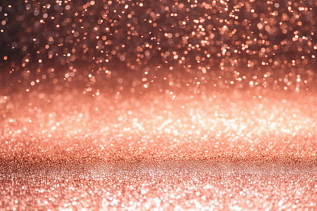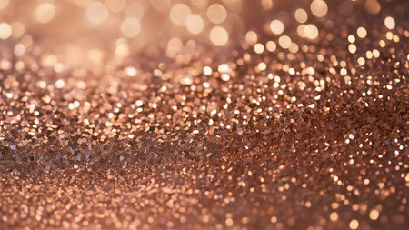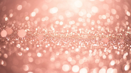 A close-up, abstract view of rose gold glitter creating a bokeh effect. Countless small, out-of-focus lights sparkle and shimmer against a softly blurred background. The color palette is dominated by warm rose gold tones, evoking a sense of luxury, elegance, and celebration. is adding a touch of glamour and festivity to related to beauty, fashion, events, or any theme requiring a sparkling and visual.