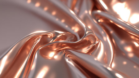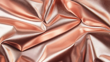 A reflective metallic fabric showcases a rich rose gold color, creating intricate folds and smooth textures. The surface catches the light, enhancing its shiny appearance.