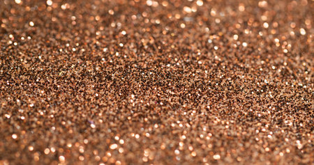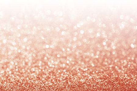 A close-up view of a rose gold glitter texture with soft, out-of-focus bokeh lights creating a shimmering and glamorous sparkling effect.