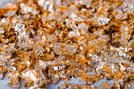 Blurred metallic foil texture in gold with creases and reflections, luxurious shimmer perfect for copy space