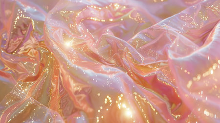 Light pink with bright gold reflections, hologram, flowing fabrics, sparkling water reflections background.