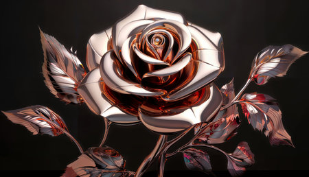 Opulent digital artwork in a luxurious metallic style, evoking romance through warm pinkish tones, intricate texture depth, and dynamic angled lighting for a premium sheen effect. Ideal for upscale branding, wedding invitations, jewelry advertising, fashion graphics, and cosmetic packaging targeting luxury markets. Versatile for print, web, and merchandise ap... AI-generated digital illustration. AI-generated illustration.