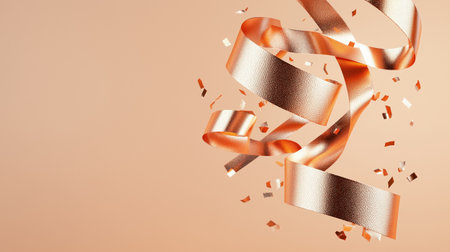 Floating rose gold ribbon with confetti on a soft beige background. Festive celebration concept for branding and event design.