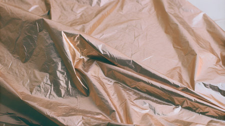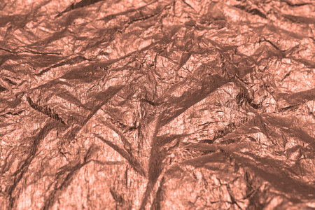 Rose gold metallic foil with deep creases and reflective highlights. Abstract wrinkled surface