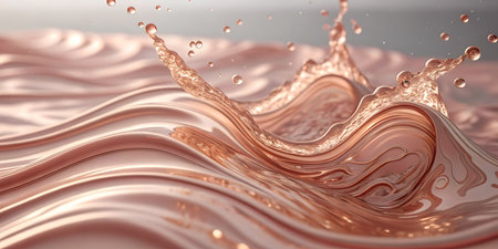 Rose-gold liquid forms elegant waves,with splashes and droplets.The background appears to be a lighter, blurred version of the same rose-gold hue.The scene conveys luxury, fluidity, and a sense of calm, almost ethereal beauty.The overall impression is one of sophistication and artistry.