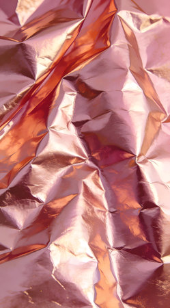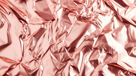 Crumpled metallic foil displays an array of rose gold hues with light reflections creating a shimmering effect. The texture and shine accentuate the depth and visual appeal of the material.