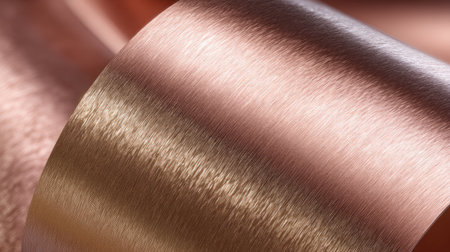 This image captures a close-up view of a polished copper sheet, showcasing its warm tones, smooth texture, and reflective properties. Ideal for design and industrial themes.