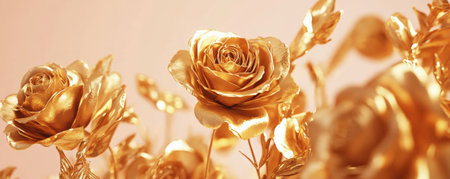 A stunning floral arrangement of metallic gold roses set against a light blush pink background, the roses' elegant glow adding a touch of luxury to the decor.