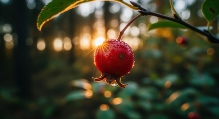 Single red berry with dew drops hangs from a branch, illuminated by the warm glow of the golden hour sun, creating a natural, vibrant scene.