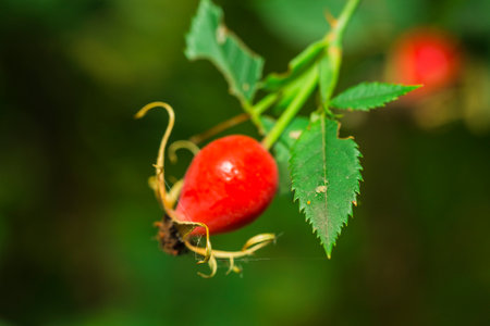Beautiful Branch with rose hips, medicinal red forest berry. Healing berry.
