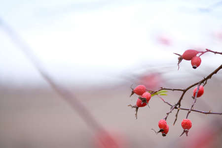 Red rosehips in a hedge in nature in early winter with defocused branches and sky in the background