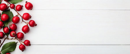 Clusters of bright red berries with shiny green leaves are artfully arranged on a white wooden surface. This setup creates a fresh, vibrant atmosphere suitable for seasonal decorations.