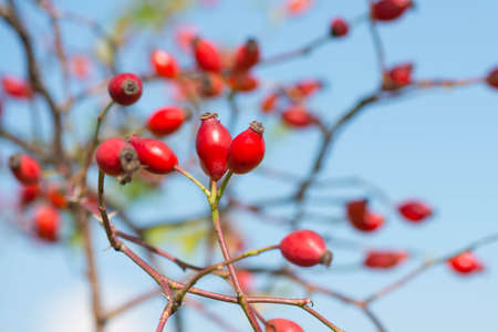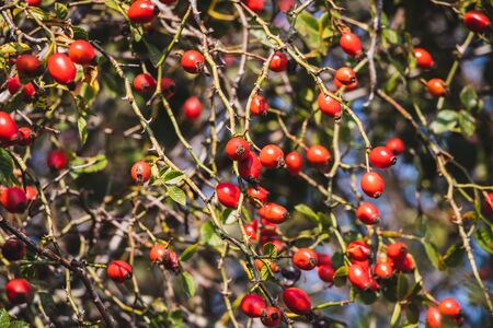 Rose hips from the bushes,Rosehip berries on the twig, natural autumn seasonal background