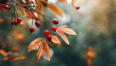 Moody autumnal dry tree leaves with red wild berries on blurred background.