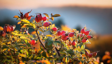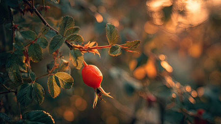 The Rose hip at sunset, Golden red sunset light filters through the leaves, still atmosphere, warm orange glow blending with natural green tones.