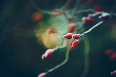 red briar on the branch covered by hoarfrost with boke