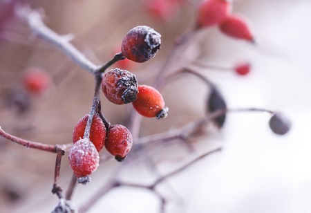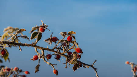 Berries of a dogrose in a hoarfrost. Close up photo