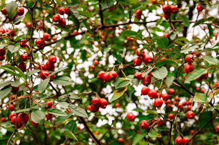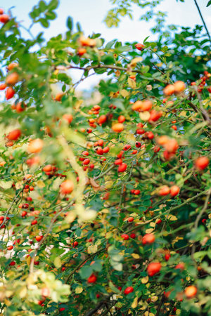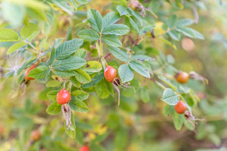 green Bush with red ripe rose hip, pharmaceutical plant