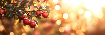 Close-up of bright red berries clustered on a green leafy branch, illuminated by soft sunlight with a blurred bokeh background.
