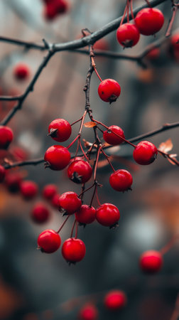 Clusters of bright red berries adorn thin branches in a misty forest. The soft morning light creates a serene atmosphere as nature awakens, showcasing vibrant colors and delicate details.