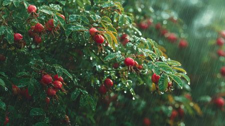A panoramic wide view of Rose hip garden growing closely together under light drizzle soft raindrops on leaves ultra realistic photography natural daylight cinematic wide composition lifelike natural scene