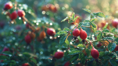 A panoramic wide view of Rose hip garden growing closely together in a dewy morning shining droplets on leaves warm soft daylight ultra realistic photography cinematic wide composition lifelike natural scene