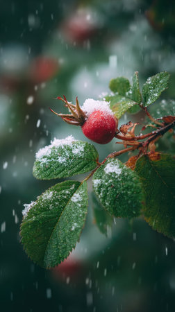 First snow falling gently on Rose hip, a few snowflakes drifting slowly and settling on the leaves; fresh air, natural.