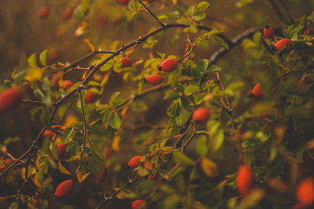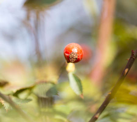 blurry photo, shallow depth of field. Rose hips contain a large amount of antioxidants, mainly polyphenols and ascorbic acid, as well as carotenoids and vitamins B and E.